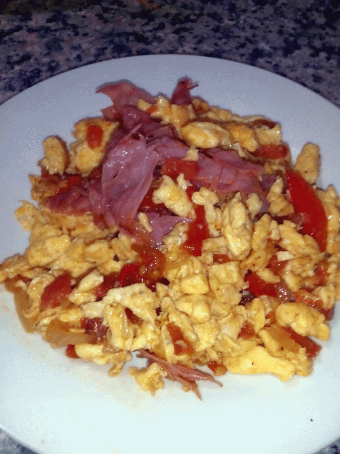Prepara unos huevos fritos o a la plancha, como prefieras. Pasa unas salchichas por la sartén y corta en rodajitas.