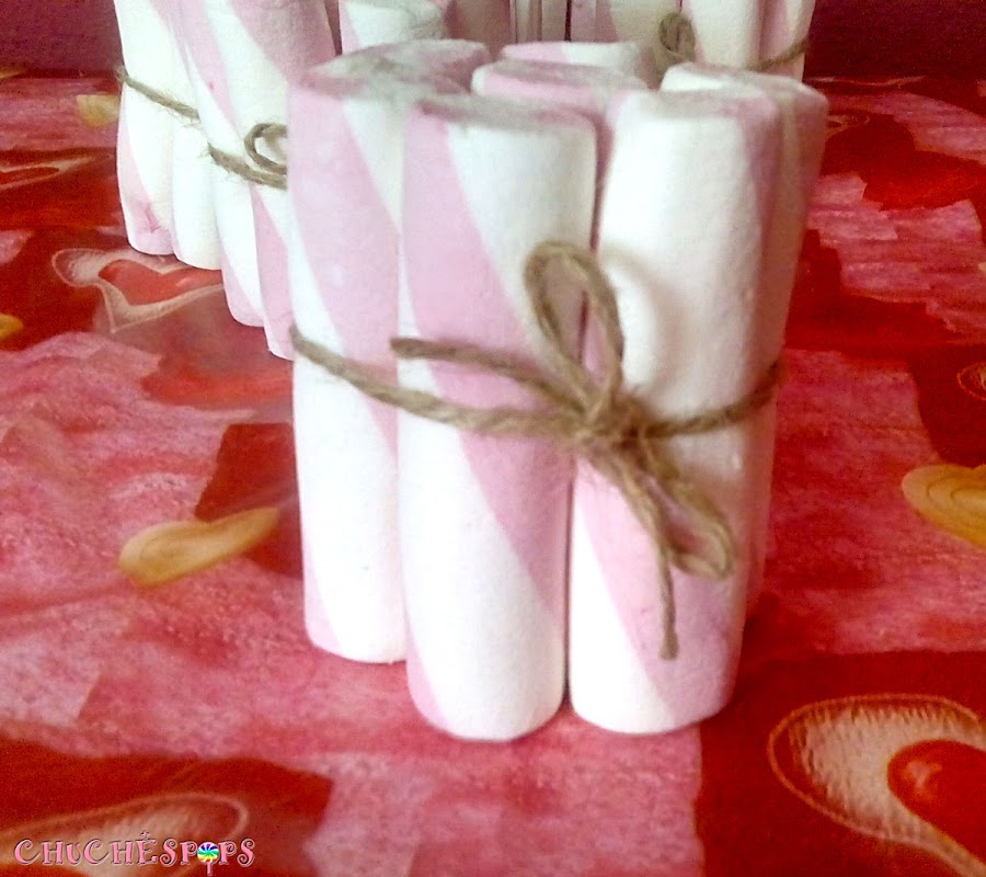 Cogemos 7 nubes de nata (crema de leche) fresa , hacemos 3 lineas en vertical de 2-3-2, medimos el trozo de cuerda necesario para atar las nubes y poder hacer un lazo y atamos con cuidado.