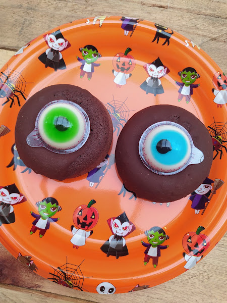 Terminamos con unos donuts de chocolate que hemos decorado con estos divertidos ojos de Halloween que no tienen alérgenos, lo podéis comprobar pinchando aquí.Podéis usar cualquiera de las recetas de donuts que hay en el blog para hacer esta divertida opción, puedes ver todas las recetas de donuts pinchando aquí.