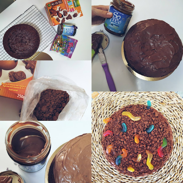 Solo necesitamos hacer un bizcocho de chocolate, cubrirlo con crema de cacao apta, nosotros hemos usado la de Plamil, troceamos galletas para hacer el efecto de la tierra y ponemos unos gusanos de chuche sin alérgenos como estos para terminar de decorar.