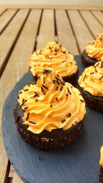 Receta de cupcakes de chocolate cubiertos con nata (crema de leche) vegetal naranja, fáciles y deliciosos. Para ver la receta de estos deliciosos cupcakes pincha AQUÍ.