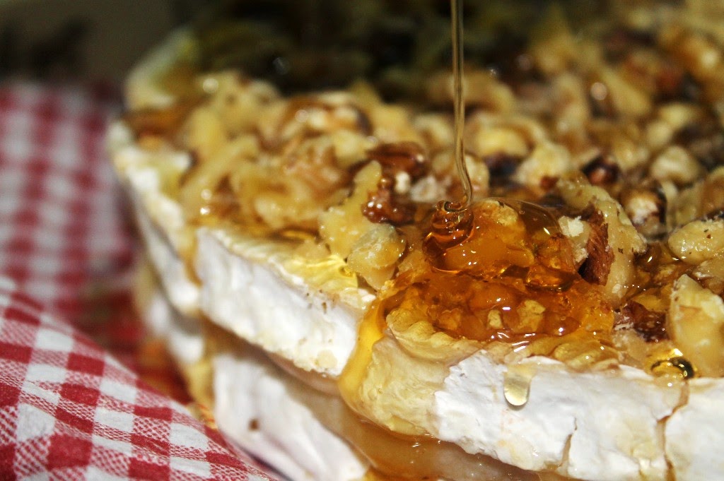 Picamos las nueces y las ponemos sobre el queso y lo mojamos con miel.