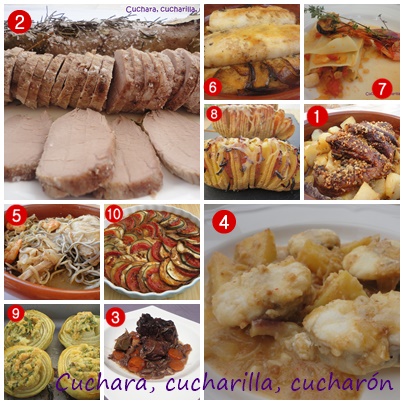 O bien nos decantamos por algo más ligero de pescado: un sabroso suquet de rape (4), una cazuela de merluza con angulas sucedáneas y gambitas (5), un bacalao gratinado con allioli sobre cama de manzanas (6) y porqué no, una espectacular lasaña de rape y gambas (7) pueden ser unas opciones muy apetecibles.Carne o pescado, lo podemos acompañar de una guarnición algo especial: unas patatas al horno, las patatas hasselback o en abanico que resultan muy vistosas en la mesa (8), o bien unas cebollas especiadas asadas (9), o la versión de película del ratatouille (10), deliciosa combinación de verduras asadas y pisto.