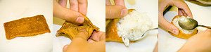 14. Coge un aburaage y presiónalo ligeramente para quitar el líquido en exceso. Abre la bolsita y llénala con un montón de arroz de sushi dentro. Pliega en el lado abierto para cerrar la bolsita.