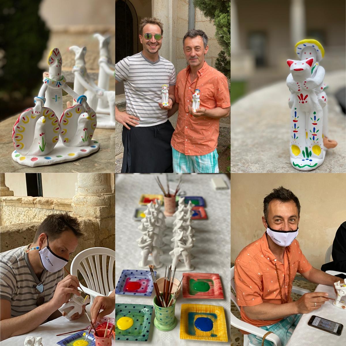 A nosotros nos esperaban en el claustro unos siurells que tendrían que ser decorados por nosotros mismos al estilo inquero, es decir con 4 colores. El orígen de los siurells no queda claro, se cree fenicio y tampoco queda claro su utilidad, pero sí se sabe según nos explicó la Artista Francisca Truyols, la primera referencia sobre siurells documentada se tiene justo en Inca. El empleo de azul y amarillo, además del verde y el rojo, sobre una figurita que puede representar varias formas, puede ser la forma que tenían los artesanos de indicar la procedencia de la obra en sí, y si en Marratxí y toda la terra del fang, se decoran en rojo y verde, Inca añadió dos colores más, la arón exacta se perdió en la noche de los tiempos.