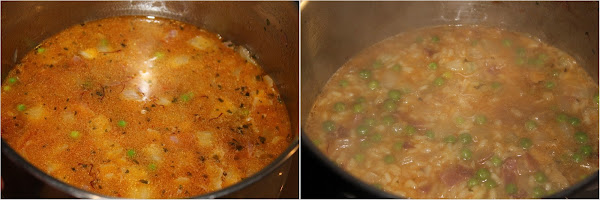 Añade los guisantes, el caldo de verduras, el pimentón, la sal, las hebras de azafrán y deja a fuego lento unos 20 MINUTOS.