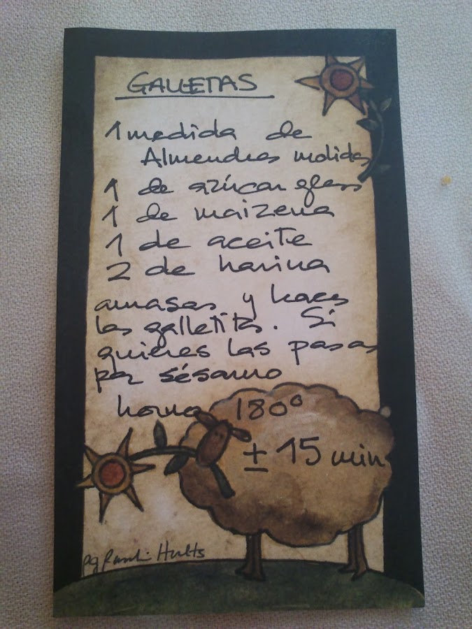 Por último, y hablando de galletas, me vinieron a la cabeza unas sencillas galletas elaboradas con aceite que hice el año pasado con una receta que me dejó mi madre. No tengo foto de las galletas, pero sí de la receta, le saqué una foto al papel donde ella la tenía apuntada: