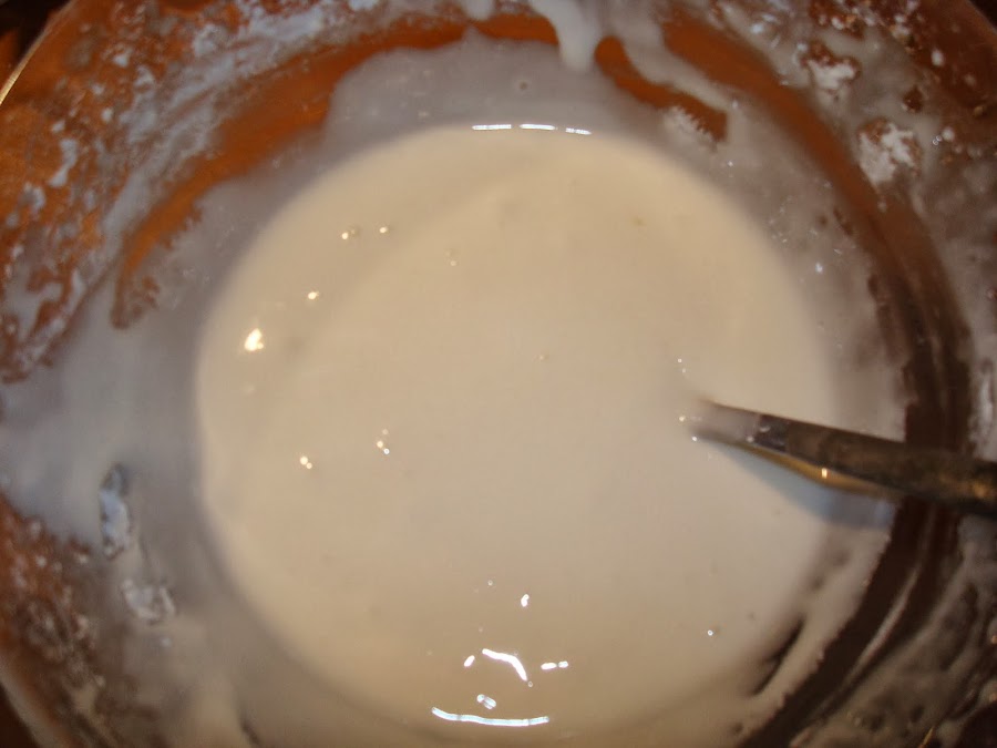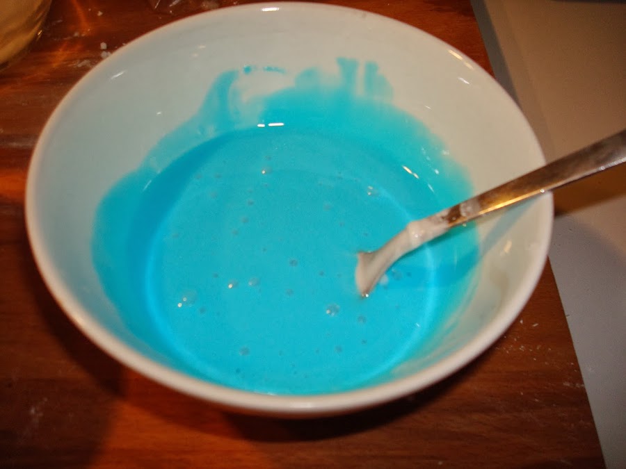 A continuación he separado la glasa del bordeado y la de interior. La del borde tiene que estar un poco mas dura y la interior un poco mas liquida. Se consigue añadiendo un poquito de agua con mucho cuidado.