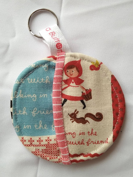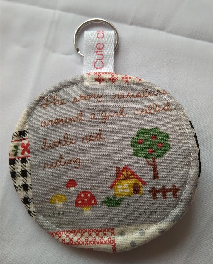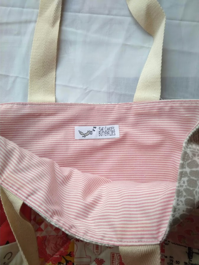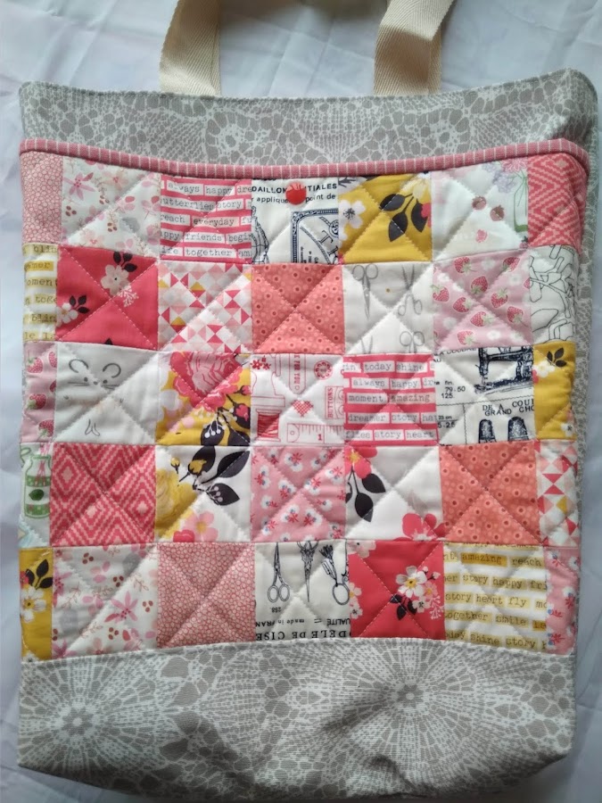 Tiene un bolsillo exterior que es un panel de patchwork con unas telas preciosas y cerrado con un snap.