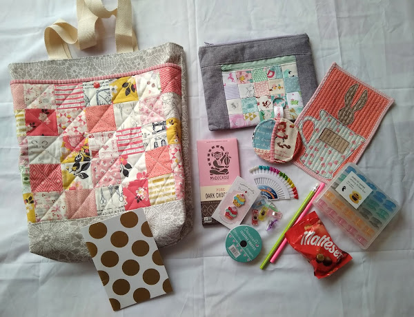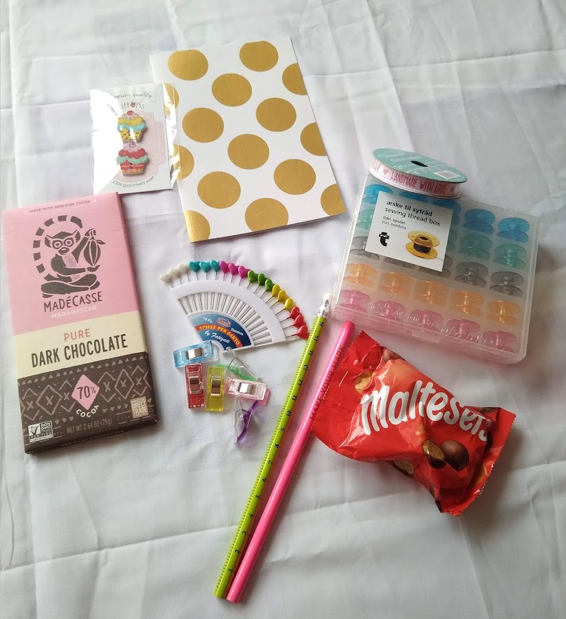 Además de una postal incluyó una tableta de chocolate negro de comercio justo, dos bolsitas de Maltesers, una caja con canillas para la máquina de coser, unos cuantos Clover clips, alfileres, unos botones decorativos, cinta decorativa y dos lápices.
