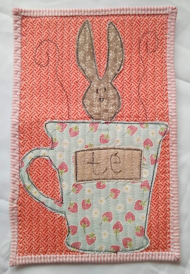 También me hizo un posatazas con un diseño de una taza humeante y un conejito. Me encanta para mi café.