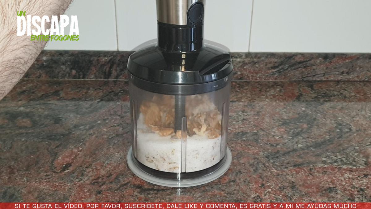 2 Mientras tanto en un procesador de alimentos añadimos las nueces y el azúcar y trituramos hasta que nos quede una textura lo más fina posible.