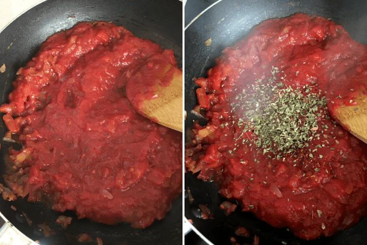 Agregar a la mezcla la salsa de tomate, 1 cucharada de sal y 1 cdta de merquén o similar. Calentar hasta que hierva, agregar 2 cucharadas de aceto balsámico (esto ayudará a bajar la acidez) y 2 cucharadas de orégano, revolver y dejar calentando a fuego bajo durante 5 minutos. Apagar el fuego y reservar.