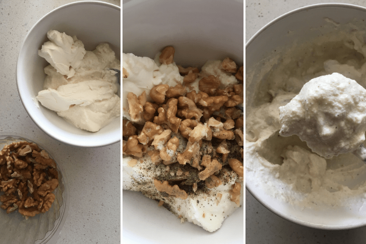 Mezclar la ricotta con el queso crema, las nueces trituradas, el aceite de oliva la sal y la pimienta hasta obtener una pasta.