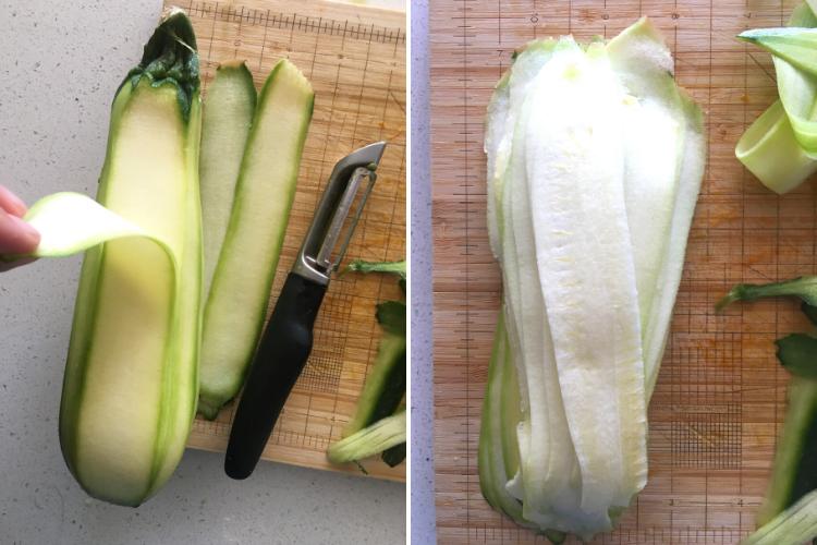 Laminar a lo largo los zapallitos con la ayuda de una mandolina o un pelador (también puedes usar un cuchillo) hasta llegar al centro (el centro no se usa en esta receta, pero no lo tires, puedes usarlo para otro plato o agregarlo a la salsa de tomate en cubitos pequeños).