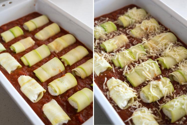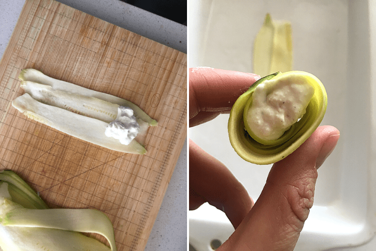 Colocar dos tiras sobrepuestas de zapallito a lo alrgo una tabla. Añadir en un extremo 1 cucharadita de pasta de ricotta y enrollar con cuidado hasta obtener un rollito relleno. Repetir el proceso con todas las tiras de zapallito hasta terminar la mezcla y/o las tiras.