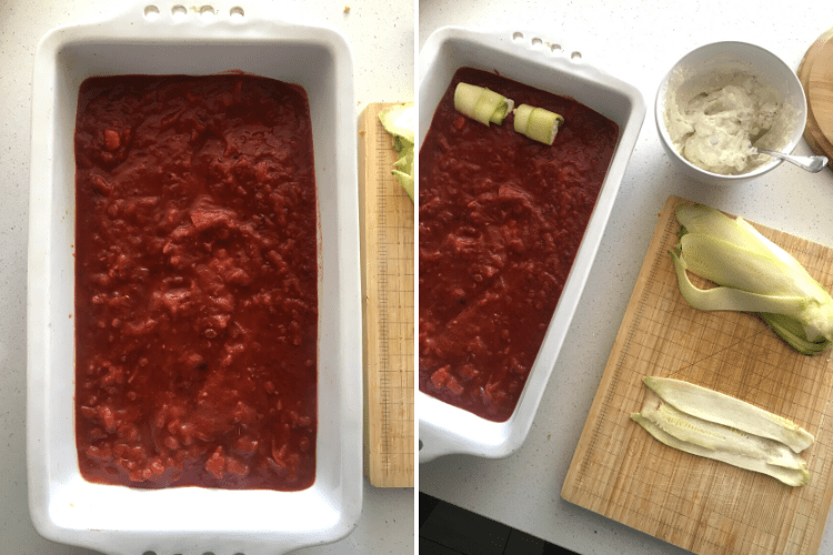 En una fuente apta para horno, colocar como base la salsa de tomate y agregar los rollitos o involtinis sobre la salsa de tomate (ideal que queden la mitad sumergidos en la salsa).