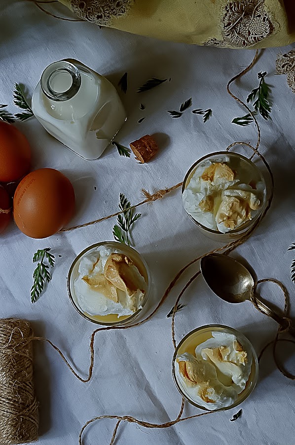4. Con una cuchara coge un poquito de merengue y colócalo sobre la crema inglesa que teníamos enfriando en el frigorífico.