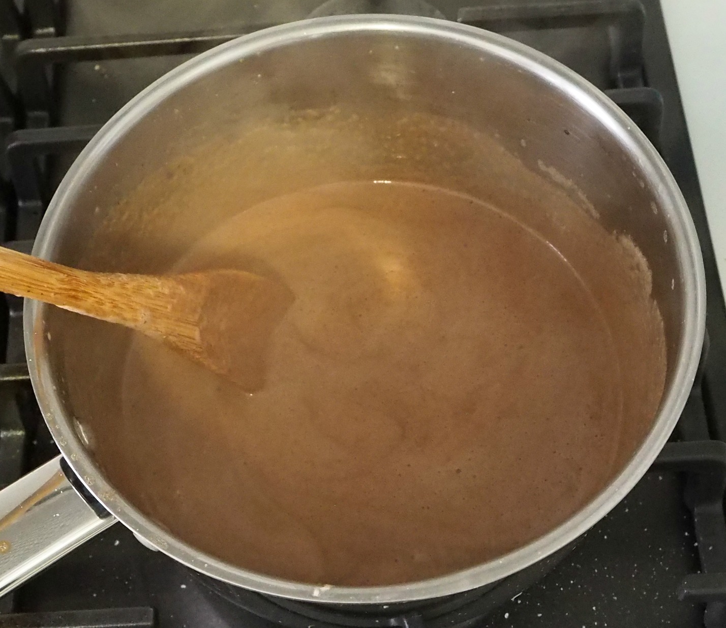 - Devolvemos la mezcla al cazo, añadimos la maizena y cocemos a fuego lento sin para de remover, hasta que espese.