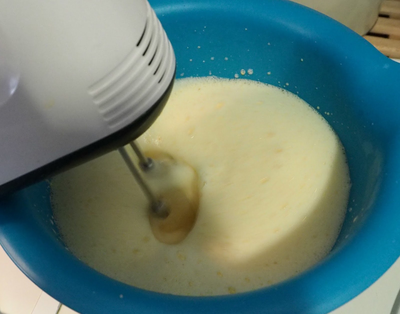- Con cuidado y sin dejar de batir para que no se cuajen las yemas, añadimos la leche a la crema de yemas y azúcar. Os aconsejo que no batáis muy fuerte porque si no se os hará mucha espuma (como me pasó) a mí, y tardará más en bajar y en formarse la crema posterior.