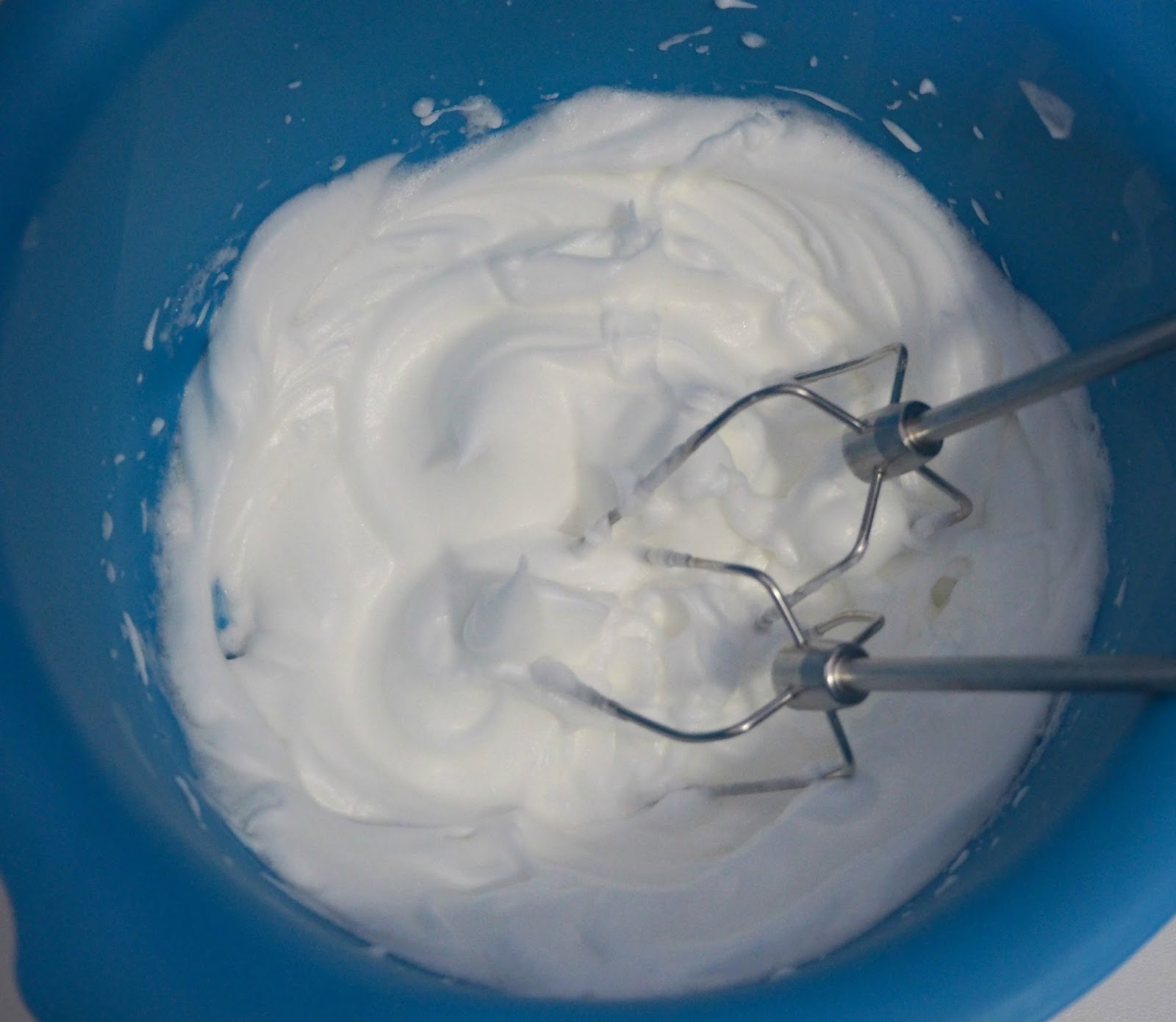 - En otro bol, montamos las claras con una pizca de sal hasta que estén firmes. Añadimos azúcar al gusto (1 o 2 cucharadas) y montamos a punto de nieve.