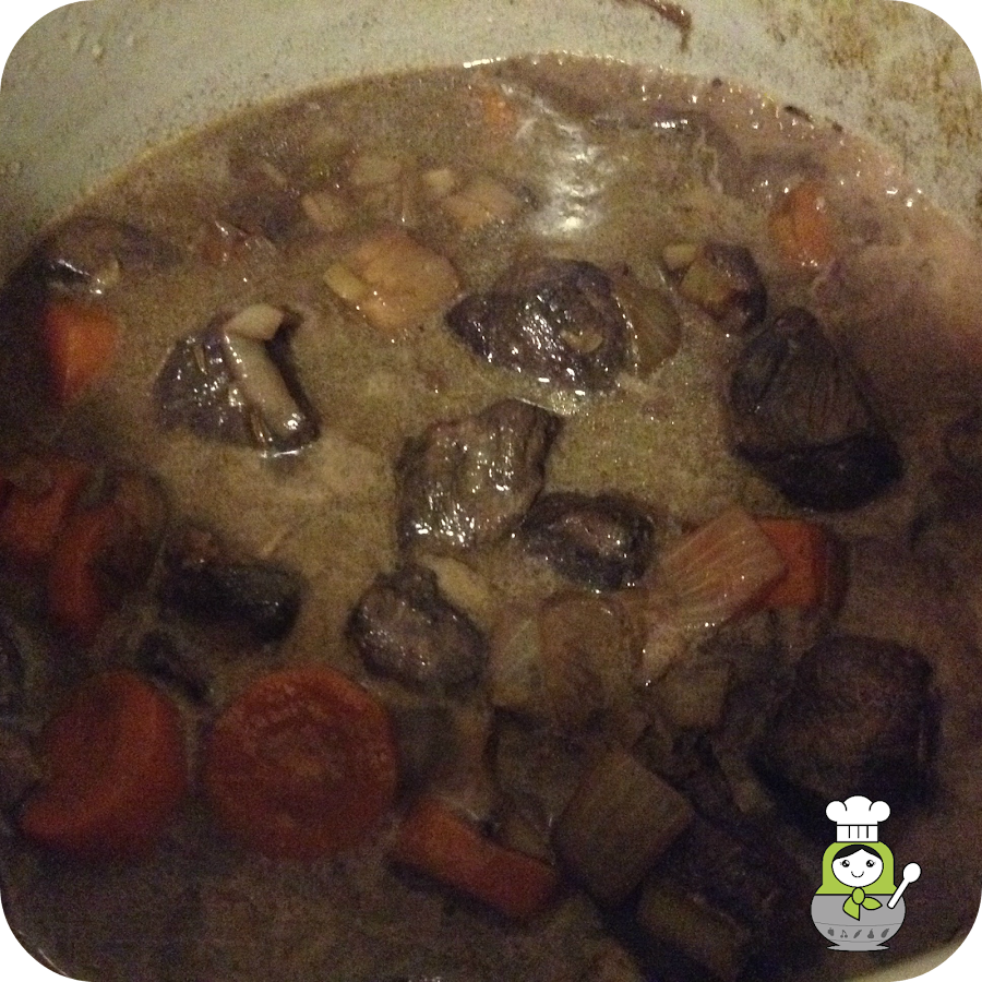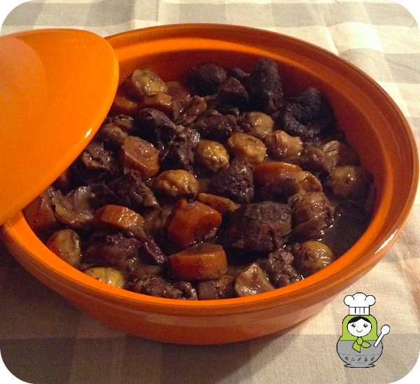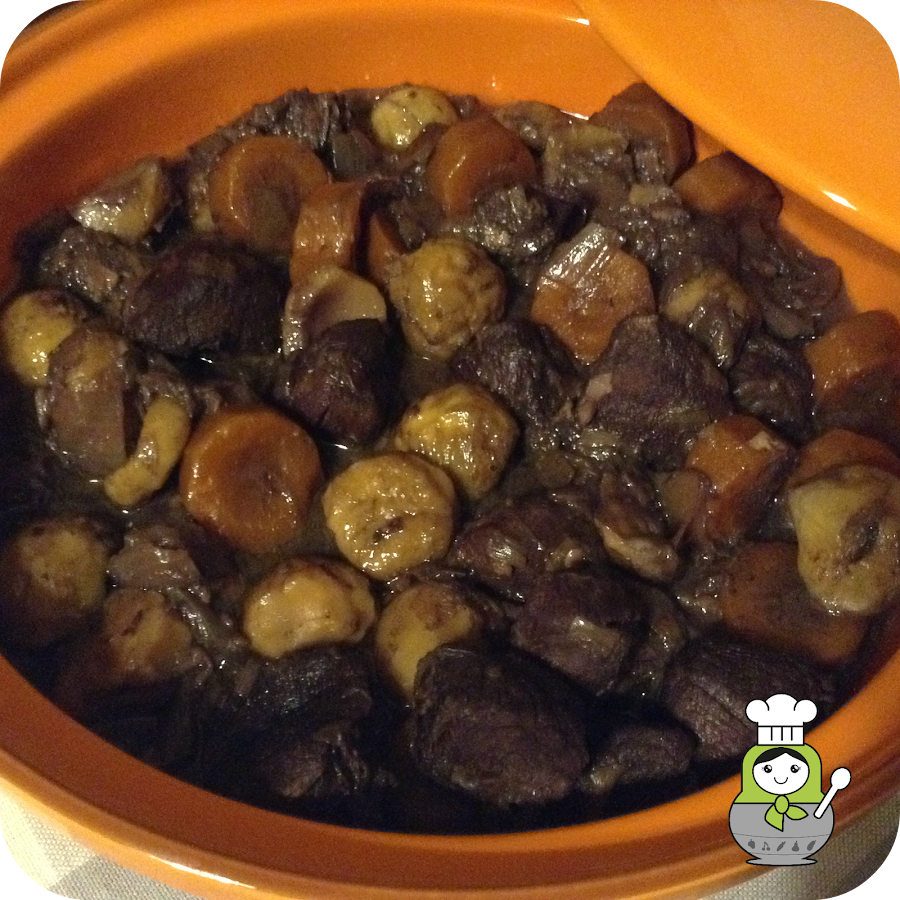 Cuando la carne lleve cociendo 1 hora y 45 minutos más o menos, echad las castañas. A las 2 horas de cocción de la carne, probad una castaña y si está cocida y la carne ya está blanda, ya podemos apagar el fuego, si no, las dejaremos un poco más.