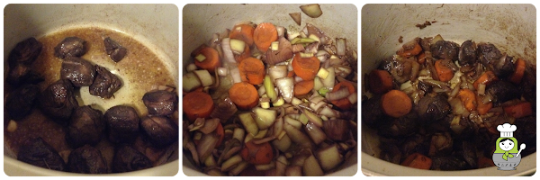 Dejamos todo al fuego hasta que se evapore el vino y después añadimos el caldo de verduras. Este puede ser casero o de pastilla. Nosotras lo usamos casero y para hacerlo cocemos, previamente y durante una hora, una cebolla, una zanahoria y un puerro cortados en trozos grandes en unos dos litros de agua. Cuando esté listo lo colamos y ya lo podemos usar. Si usáis el caldo de pastilla, tenéis que disolverla en un litro de agua y dejar cocer durante unos 10 minutos.