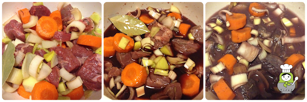 El jabalí, como todos los animales salvajes, tiene una carne muy dura así que para comerla, lo primero que tenemos que hacer es ponerla a macerar para que se ablande un poco. Para ello, 48 horas antes de que vayamos a cocinarlo, picamos el jabalí en trozos no muy grandes (recordad que cuanto más grandes sean los trozos, más tiempo de cocción van a necesitar) y lo ponemos en un bol grande junto a la cebolla, la zanahoria el puerro y dos dientes de ajo, todo picado. Añadimos las especias y la sal y cubrimos la mezcla con el vino tinto (nosotras hemos escogido un vino gallego, un Mencía, que le va como anillo al dedo a esta receta). Revolvemos y lo dejamos en la nevera durante 2 días (revolviendo de vez en cuando).