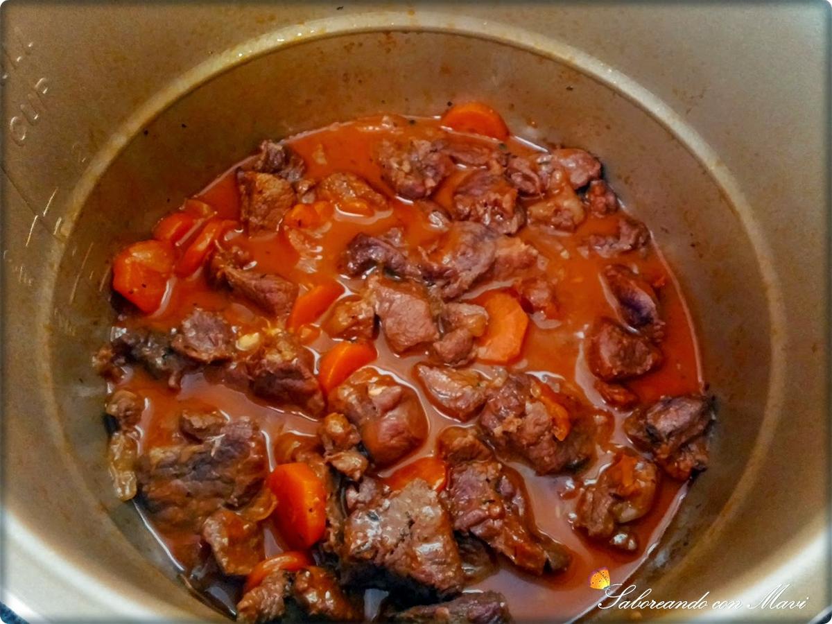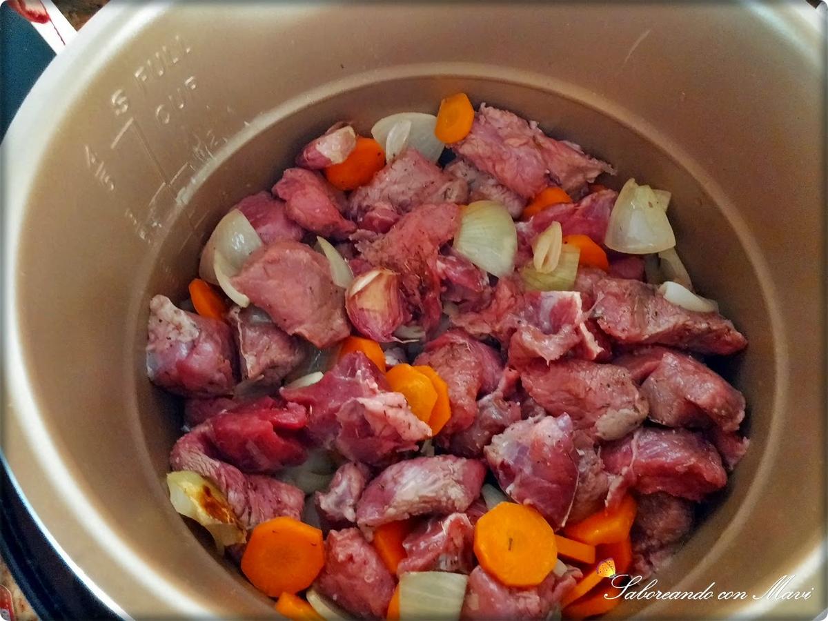 Tapamos y programamos menú carne 30 minutos válvula cerrada presión alta. Yo la tuve primero 20 minutos pero la carne de jabalí es bastante apretada y le añadí 10 minutos más. Dejar despresurizar solo.