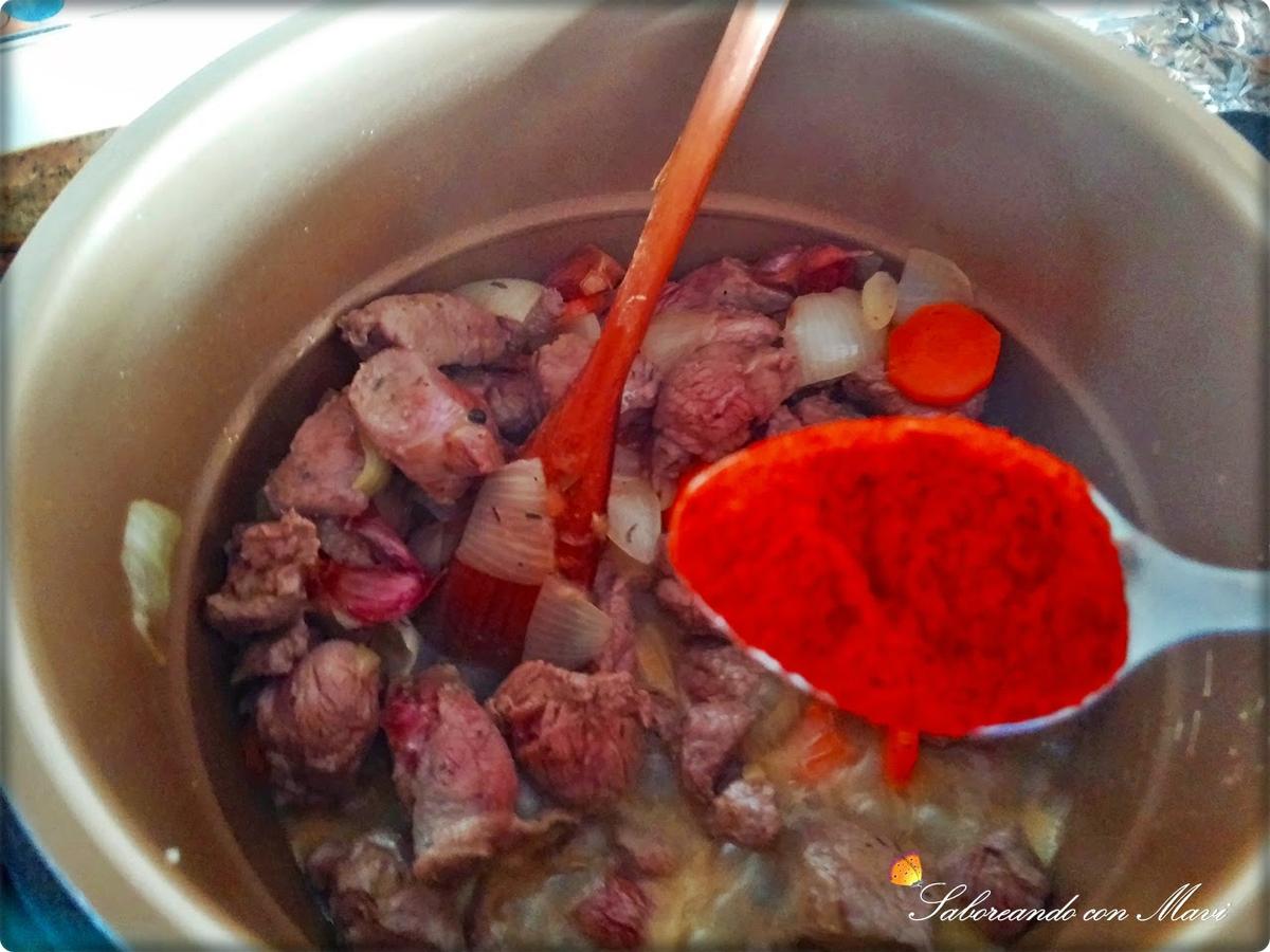 En seguida agregamos el pimentón, removemos, la pastilla de caldo y los granitos de pimienta.