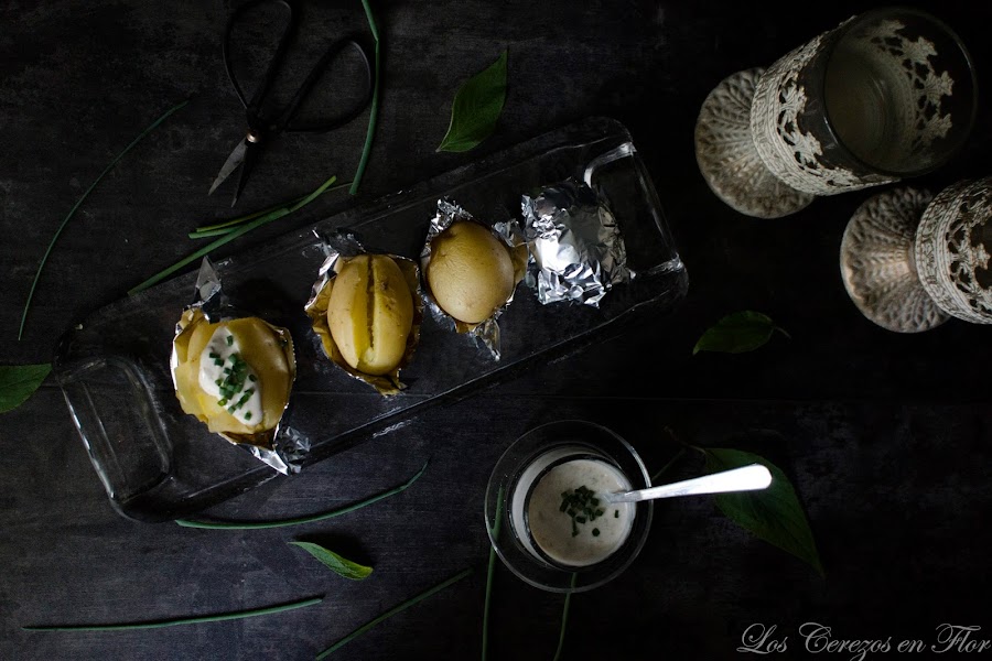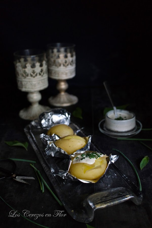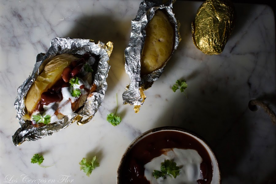 Se acabó la buena vida, las vacaciones pasaron al baúl de los recuerdos y ya toca empezar a publicar y llenar el blog de sencillas, fáciles y especiales recetas cómo estas Jacket Potatoes, unas con un relleno de chile con carne y otras más chic y refinadas de crema de trufas y hongos. Buen comienzo no?. No hay que complicarse la vida, en la sencillez reside el éxito. Recuerdo mis fines de semana paseando por Londres o por sus alrededores y llegar la hora de comer y tener más que claro qué picar. Sabéis los dibujos animados cuando el perro en cuestión sigue el rastro de un buen estofado dejándose mecer y arrastrar por ese olorcito irresistible? Pues esa era yo en versión femenina jajaja, normalmente siempre elegía el mismo relleno, atún con mayonesa, maíz y cebolla mhmmmmmm estoy babeando. La patata recién horneada, con la piel bien crujiente y bien asada, calentita y con ese relleno rebosando hasta el codo y dándome la posibilidad de rechupetearme los dedos pasando si era correcto o no..qué gustazo!!! Mi marido siempre se tiraba casi sin mirar a las rellenas de chile así que como siempre quiero complacerle, he sido super original preparando sus preferidas...si es que me merezco un imperio!. Es una receta fácil no, lo siguiente, perfecta con patatas baby como parte de un aperitivo o en un brunch, y en la versión grande para una cena informal, le pones una ensalada y menú completo.