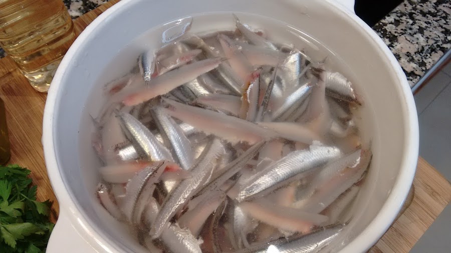 Escurrir y poner los boquerones en dos partes de agua por una de vinagre, junto con la sal.