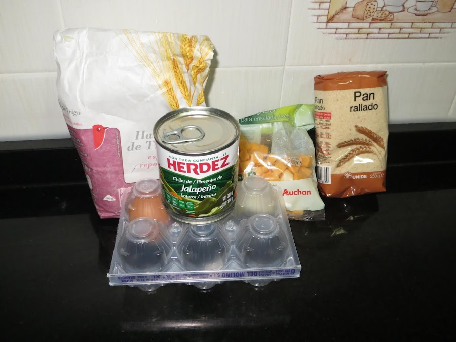 Una vez que tenéis vacíos los jalapeños los rellenáis de queso cheddar, ya puede ser rallado o en trocitos para ensaladas como he hecho yo. Luego los rebozáis en harina, huevo batido y pan rallado y volvéis a darle un segundo rebozado, esta vez sólo con huevo y pan rallado.