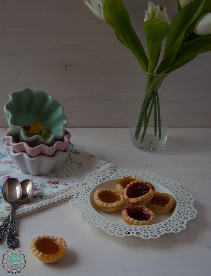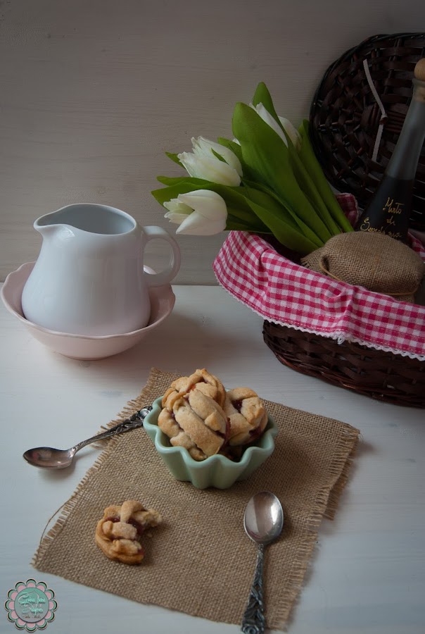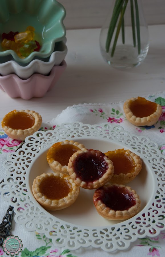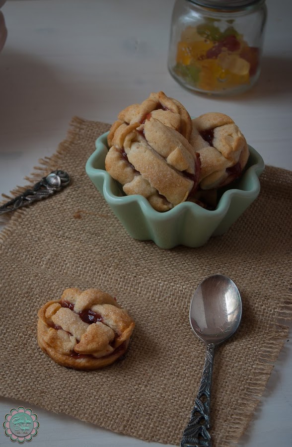 Hoy os traigo una receta de esas que me ponen nostálgica, con las que me invaden los recuerdos. Son tartaletas de mermelada. Las aprendí a hacer de adolescente durante mi estancia en Inglaterra y, desde ese momento, se convirtieron en una de esas recetas que sabes que te acompañarán siempre... Hoy os he traído estas pastitas en dos presentaciones, la clásica jam tart, y otra mostrando una galleta enrejada al más puro estilo Caperucita Roja. No lo puedo evitar, este tipo de presentación de galletas y tartas me recuerda a los cuentos clásicos; por eso, os las presento en las fotos con la cesta que Caperucita le llevaba a la Abuela (no me he dado un golpe, es que he vuelto a la más tierna infancia...).