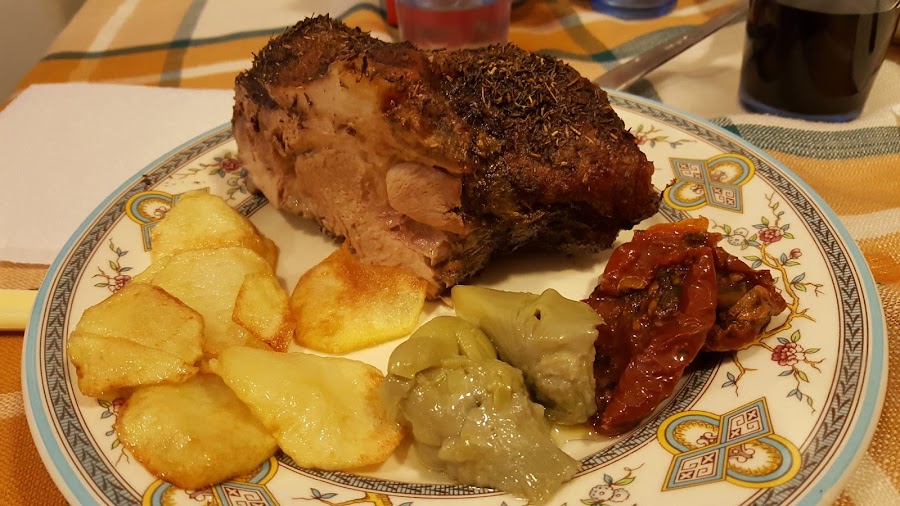 7.- Pasado el tiempo lo sacamos del horno y emplatamos. Esta vez le puse de guarnición lo que tenía por la nevera: unos tomates secos, unas alcachofas y unas patatas fritas.