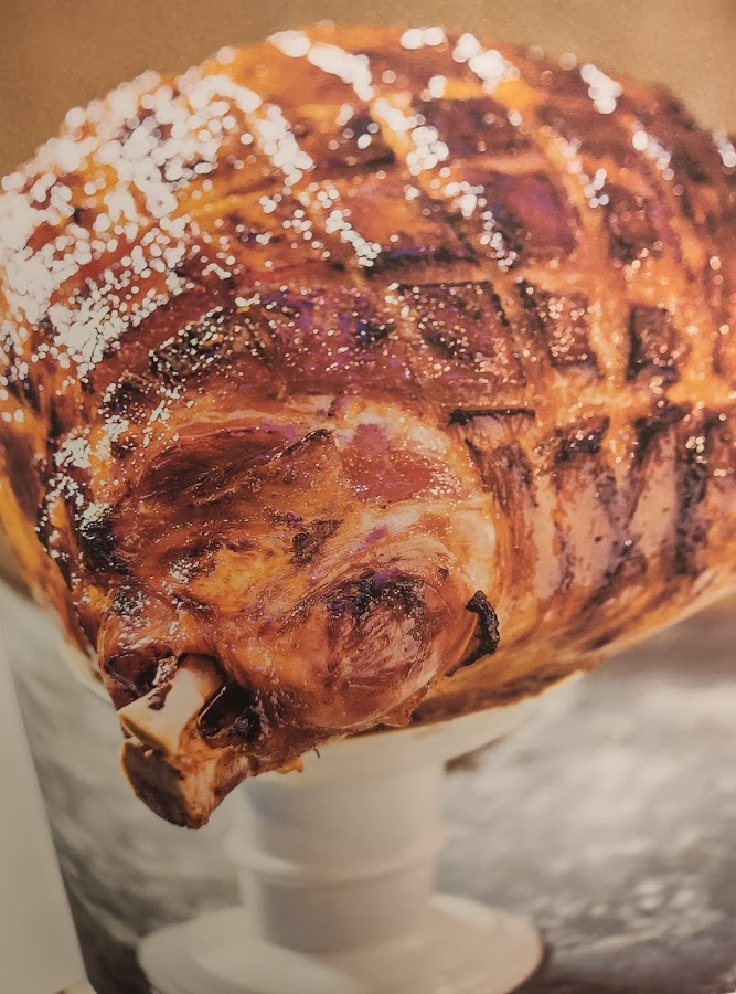 Anotamos el peso del jamón, introducimos el jamón en una bandeja refractaria. Vertemos la mitad de la pasta del glaseado sobre el jamón y lo metemos al horno. Asamos durante 45 minutos por cada kilogramo. Pasada la mitad de este tiempo, sacamos el jamón y añadimos por encima la otra mitad del glaseado. Volvemos a meter al horno para que se acabe de hacer.