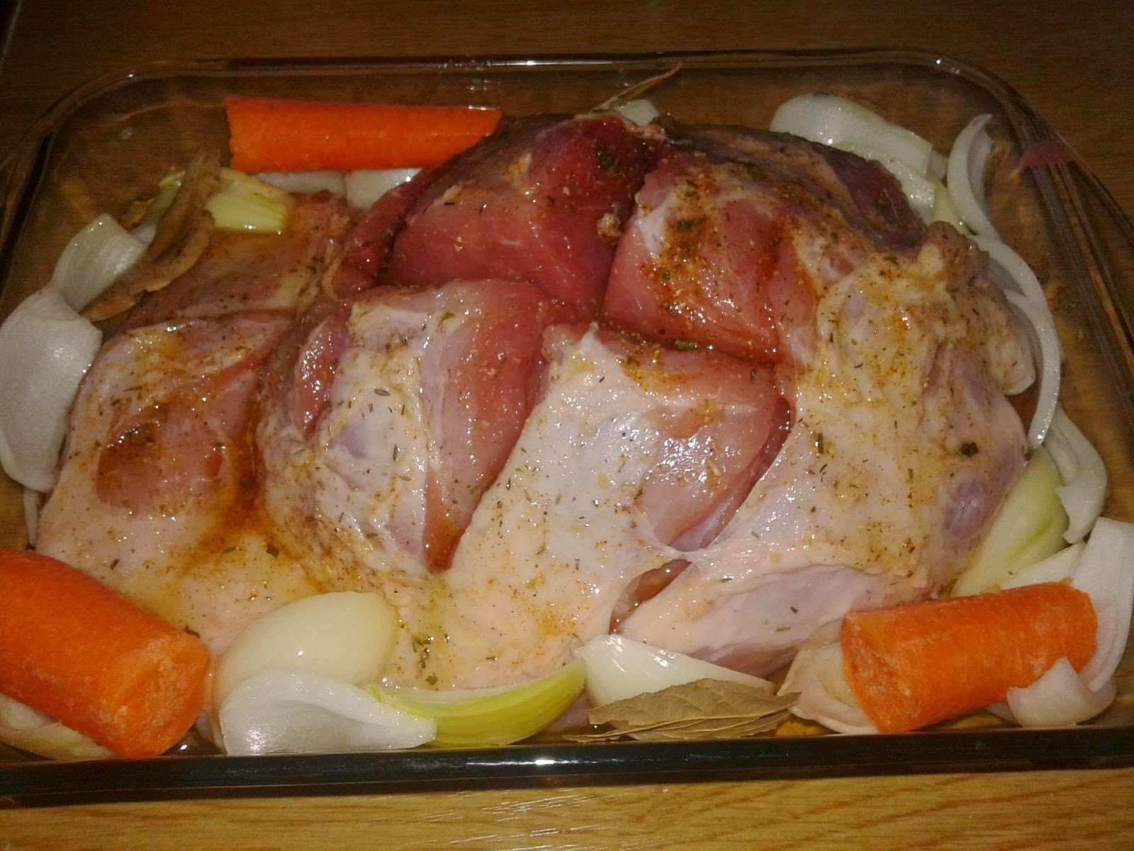 Al día siguiente, cuando vayamos a cocinar, le echamos la sal al jamón adobado. Agregamos la cebolla, la zanahoria, unas hojitas de laurel y el tomillo. Echamos un buen chorro de aceite de oliva y de vino blanco.