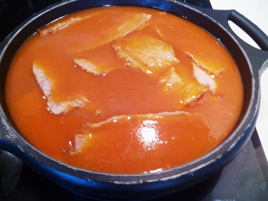 Una vez hecho el jamón asado cortar en filetes finos y poner en una tartera con la salsa dejar 10 min a fuego lento para que coja sustancia. Poner la tapa.