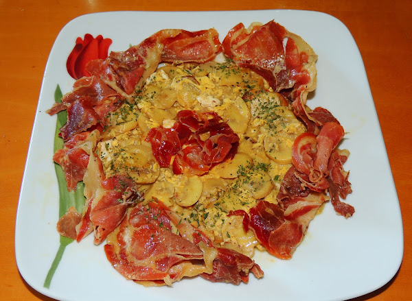 Se coloca encima y alrededor el jamón. Se espolvorea de perejil picado.