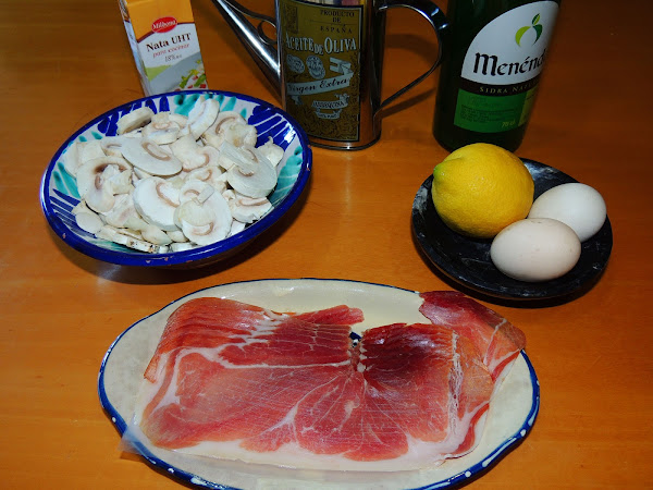 6 lonchas de jamón serrano, 200 gr. de champiñones, 9 cucharadas de nata (crema de leche) para cocinar, medio limón, 2 yemas, un vaso de sidra, aceite de oliva, sal perejil picado.