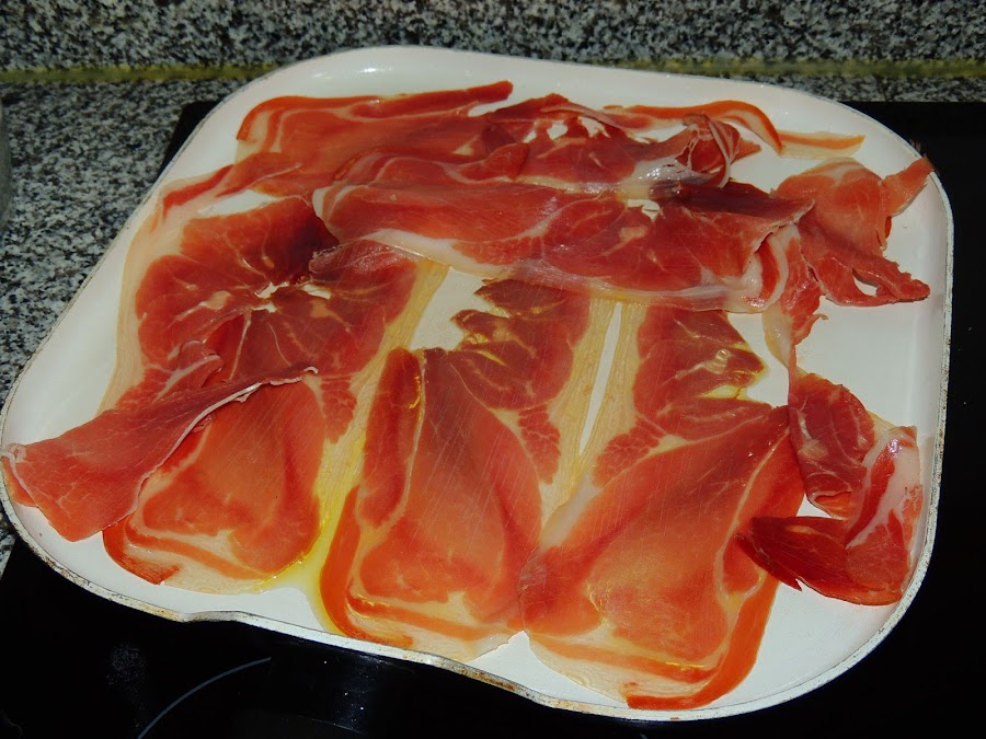 Por otra parte, se asa el jamón con un poquito de aceite.