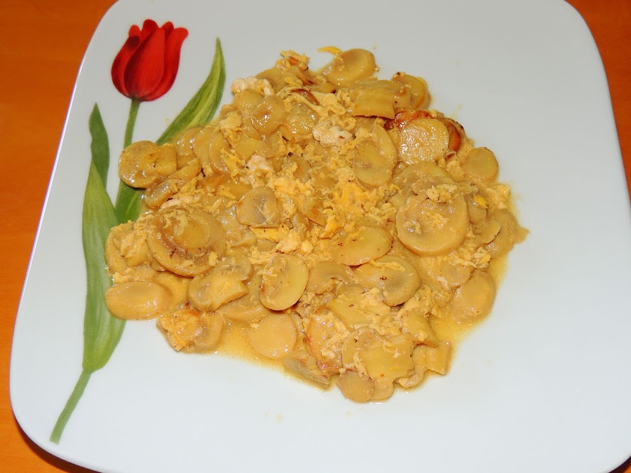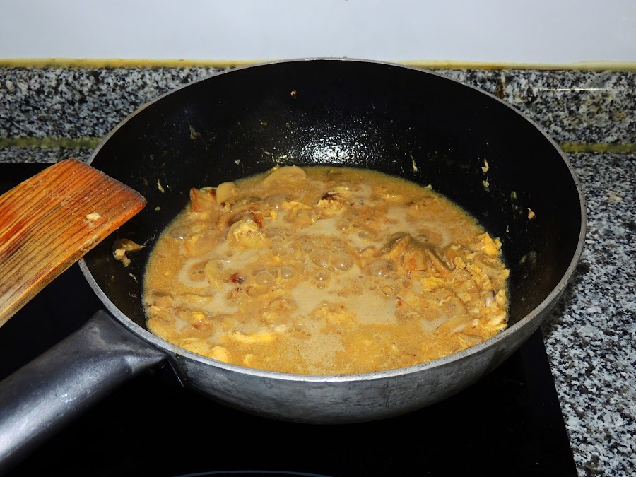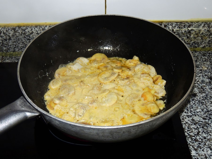 Se deja unos cinco minutos más. Seguidamente, se aparta el jamón y se añaden las yemas, que se mezclan bien con los champiñones a la sidra.