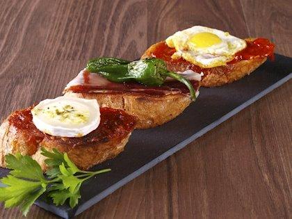 Diferentes tipos de bocadillos, tostas y sandwiches con jamón