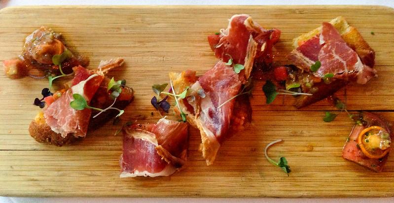 Lo mejor es dejar que cualquier jamón medio decente brille por si solo en el centro de la mesa y no sacar infinidad de aperitivos o entradas. Si estamos comiendo un buen ibérico, con su exuberante grasa intramuscular con ácido oleico monoinsaturado, derivado de la bellota, mejor no marear al personal con nada que no sea este jamón (quesos, pulpo, mejillones, embutidos,…) Todo lo que saquemos para acompañar a un buen jamón sobra, va a marear la perdiz y no le prestaremos la atención debida a su magnífico sabor.