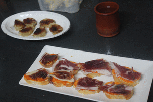 Colocamos las rebanadas en dos platos y cubrimos con lonchitas finas de jamón salado recién cortado.