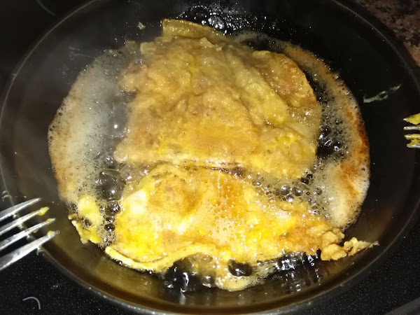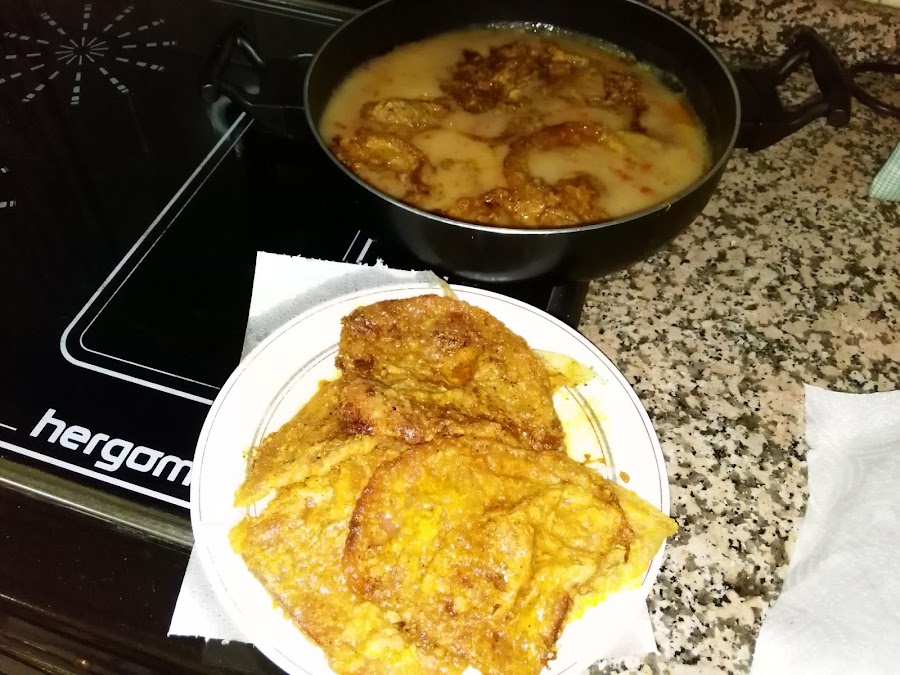 Después de frito vamos metiendo en la salsa, y otros los dejamos en el plato sin salsa, así para todos los gustos