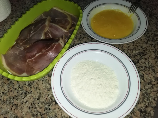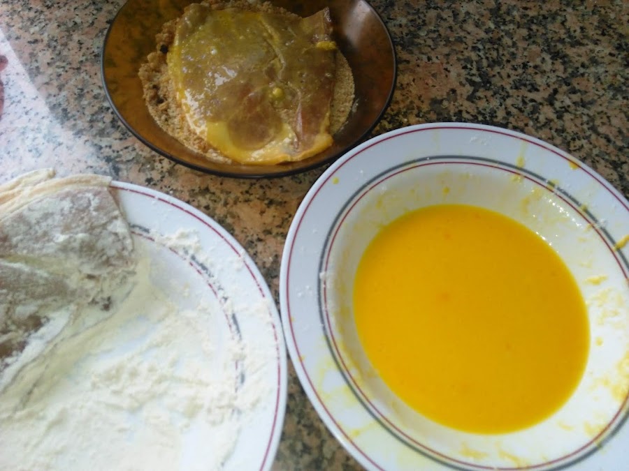 Una vez escurrido y seco el jamón pasamos por harina, huevo y a freír directamente por ambos lados