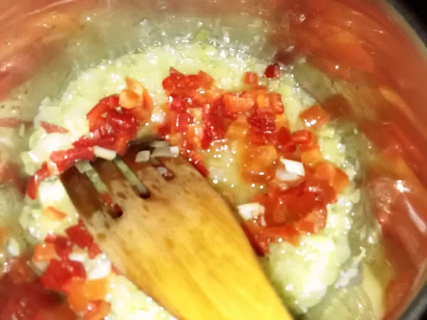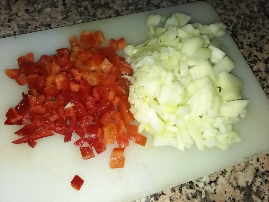 Hacemos la salsa cuando queramos y así ya la tenemos lista, troceamos bien la cebolla y el pimiento y luego lo pochamos en un poco de aceite, revolviendo cada poco
