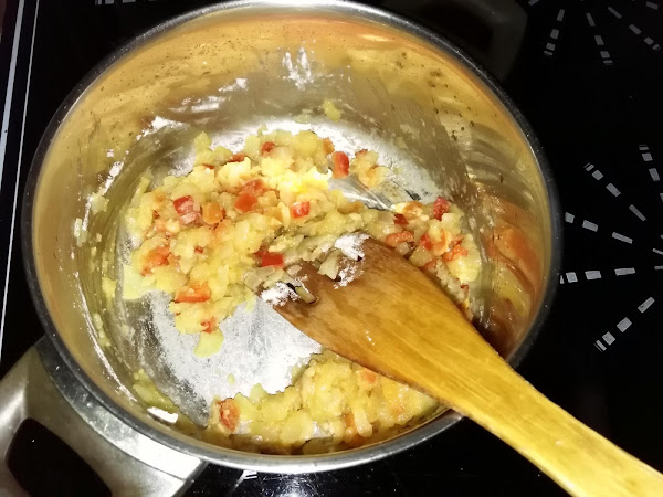 Cuando la verdura esté bien pochada añadimos 1 o 2 cucharadas de harina, dejamos hacerse revolviendo bien y luego añadimos agua hervida, dejamos hacerse lentamente, ha de quedar un poco espesa, ponemos una pizca de sal
