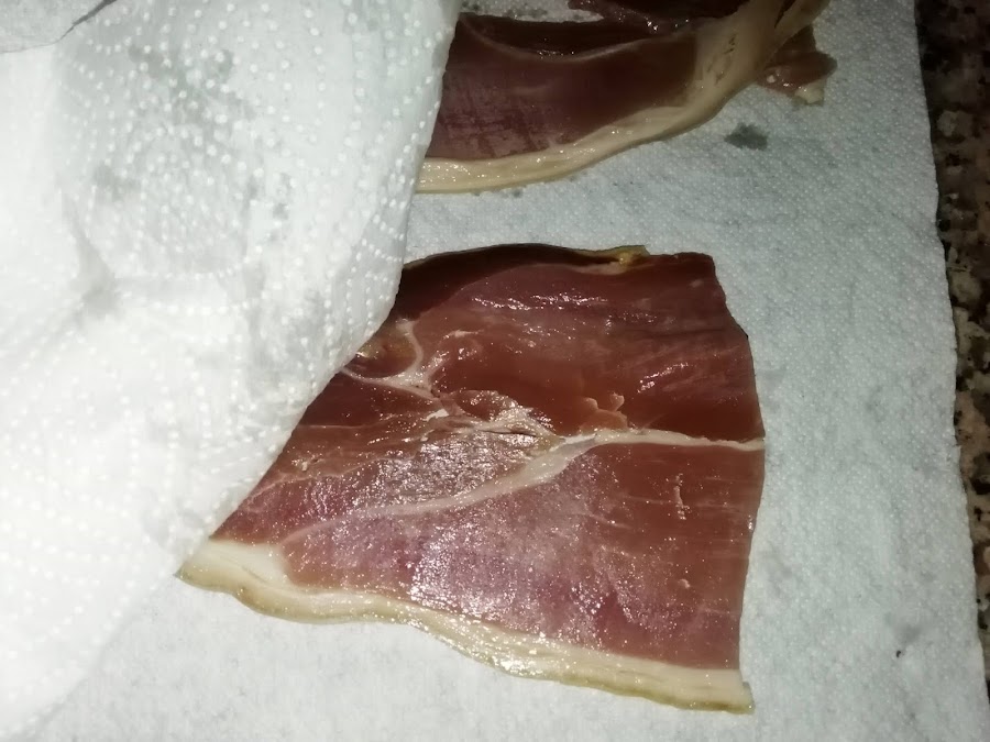 Quitamos la leche del jamón y lo ponemos a escurrir, luego antes de rebozar lo secamos bien con papel de cocina, así no saltará a la hora de freír.